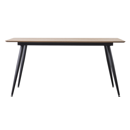 Aptly Rectangular Wooden Dining Table In Natural Oak, This stunning dining table offers a sleek contemporary look, combining an oak veneer top with elegant black metal legs, whilst chrome feet add the finishing design detail. It is part of our Packed-Flat Design Project which offers easy delivery to any room in any property and reduces the packaging needed. Assembly is required, but all the tools needed are supplied. FEATURES : Material : MDF, Oak Veneer, Iron Finish : Natural Aptly Rectangular Wooden Dining Table In Natural Oak This stunning dining table offers a sleek contemporary look Combining an oak veneer top with elegant black metal legs Whilst chrome feet add the finishing design detail It is part of our Packed-Flat Design Project which offers easy delivery to any room in any property and reduces the packaging needed Assembly is required, but all the tools needed are supplied Available at an affordable price Images shown are for illustration purpose only DIMENSIONS : Height : 750mm Width : 1600mm Depth : 900mm