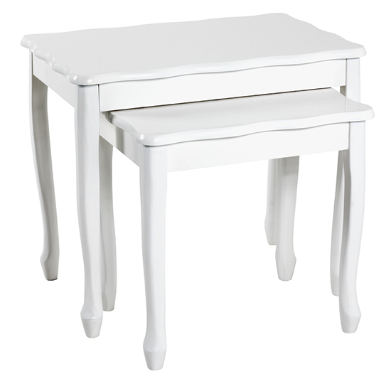 FEATURES : Material : Solid Wood, MDF Finish : White Wooden Set Of 2 Side Tables In White Frame made of solid wood lacquered in white Shelves made of MDF lacquered in white Available at an affordable price Images shown are for illustration purpose only LARGE TABLE DIMENSIONS : Height : 48cm Width : 56cm Depth : 36cm SMALL TABLE DIMENSIONS : Height : 41cm Width : 43cm Depth : 32cm