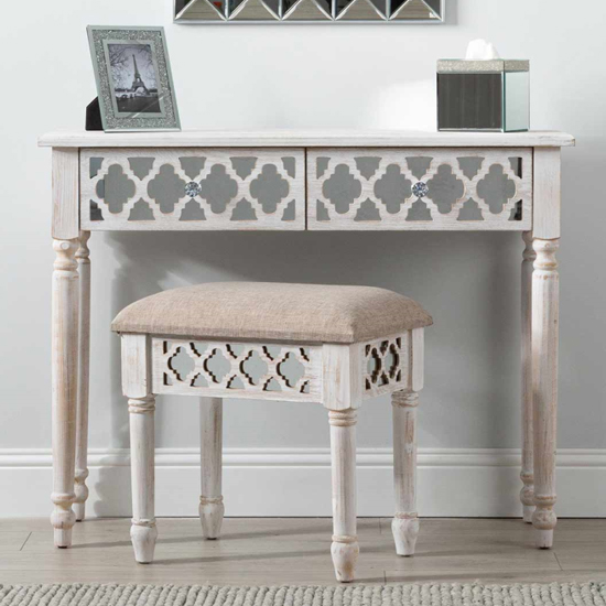 Introducing the Halifax Mirrored Console Table with 2 Drawers in Natural from Furniture in Fashion, the perfect addition to any modern home. Featuring a sleek mirrored finish and a natural wood frame, this console table offers both style and functionality. With two spacious drawers, you’ll have ample storage space for your belongings. Whether used in a living room or hallway, this versatile console table is sure to make a statement. Upgrade your home decor with the Halifax Mirrored Console Table with 2 Drawers in Natural today by Furniture in Fashion! FEATURES : Material : MDF Wood, Mirror Finish : Natural Two drawers console table is inspired by the understated elegance of a New England beach home Featuring a washed ash effect finish, the spacious drawers are beautifully enhanced by mirror overlayed With intricate fretwork detailing and crystal handles Stool shown in the image is not included This piece would also be ideal as a writing desk/workstation Available at an affordable price Images shown are for illustration purpose only DIMENSIONS : Height : 82cm Width : 107cm Depth : 36cm