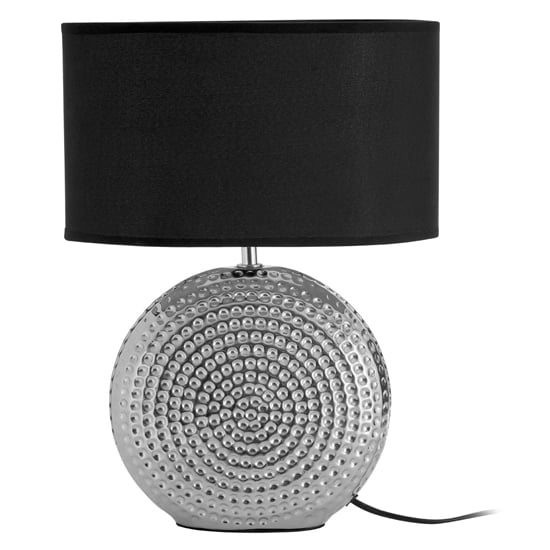A striking feature even when the light isn’t on, ensures the table lamp, with its chic Hamero effect, will make a wonderful addition in your home. The circular base is durable, sturdy and with its chrome Hamero finish effect the stylish lamp will make a great feature in your home radiating light and elegance into the room. Complementing the base is the chic black fabric shade that will emit a soft warm glow to the surrounding area. The eye-catching table lamp will complement a modern setting while enlightening the room. A sleek ceramic table lamp that adds boutique hotel style to the living room or bedroom. FEATURES : Material : Ceramic, Linen Finish : Black, Chrome Bulb Type : E14 Bulb Bulb Wattage : 40w Radiate light and style Hamero effect Great feature Durable and sturdy Ideal for bedroom, dining room or living area Wipe clean with a soft cloth Do not use abrasive cleaners Available at an affordable price Images shown are for illustration purpose only DIMENSIONS : Height : 40cm Width : 29cm Depth : 17cm
