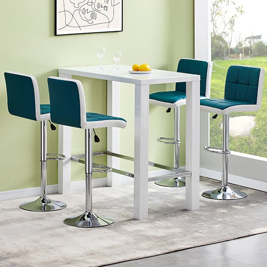 Jam Rectangular Glass White Bar Table 4 Copez Teal Stools