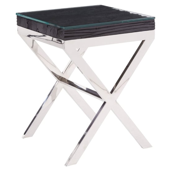 With the simple form and minimalism, this side table will enhance the modern living room decor. FEATURES : Material : Glass, Stainless Steel, Sal wood Finish : Clear, Silver, Black black salvaged wood forms rectangular top of this side table, further enhanced with the clear glass slab The cross base in mirrored silver finish offers a tonal contrast to the black elements and rustic texture Available at an affordable price Images shown are for illustration purpose only DIMENSIONS : Height : 61cm Width : 46cm Depth : 46cm