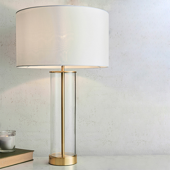 Beautifully simple table light with a clear glass base, vintage white faux silk shade and a brushed gold effect finish. Dimmable via a clever 3 stage touch dimmer. FEATURES : Material : Steel, Fabric, Glass Finish : Satin Brass, Vintage White, Clear 40W E27 GLS (bulb not included) Supplied with touch 3 stage dimmer switch Satin brass plate, clear glass & vintage white fabric Constructed from fabric & steel & glass Available at an affordable price Images shown are for illustration purpose only DIMENSIONS : Height : 570mm Shade Height : 200mm Shade Diameter : 350mm