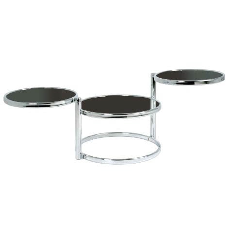 Moon Swivel Coffee Table In Black Glass With Chrome Frame Finish: Black Glass Features: A uniquely shaped glass coffee with circular rotating shelves Elegant designed with a strong sense of style in mind Strong chromed steel frame supports the rotating shelves Contemporary table with a chrome frame & shelves made of black tempered glass This coffee table is saves space via shelves that can be folded on top of each other The top two rings swivel on a pivot point to give you the option of three table surfaces At an affordable price Dimensions: Width: 58140cm Depth: 50cm Height: 43cm