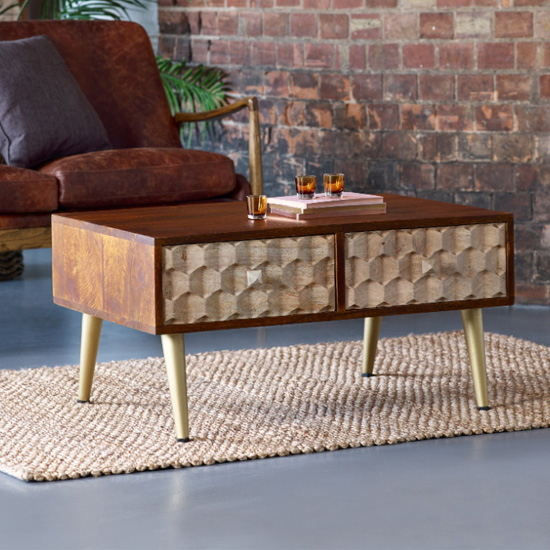 Rectangular Coffee Table with 2 Drawers, featuring CNC cuts on the front of the drawers, matching wooden handles and angled metal legs. The unit will come fully assembled, only the legs must be attached. FEATURES : Material : Solid Mango Wood, Metal Finish : Dark Walnut, Gold Gold metal inlays Eco Friendly wood used Drawer Upper Shelf Dimensions (Hx Wx D) : 12 x 36 x 32cm Colour variations due to natural wood colour Available at an affordable price Most Stylish and Unique piece of furniture Images shown are for illustration purpose only This ultra modern pieces of furniture will make you to envy of all DIMENSIONS : Height : 40cm Width : 85cm Depth : 55cm